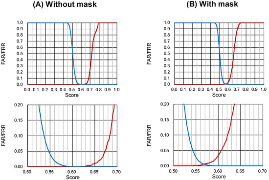 False rejection rate (FRR) and false acceptance rate (FAR) under conditions (A) without and (B) with a mask. The upper panels show the total range, and the lower panels extend the crossing ranges between the FRR and the FAR. The threshold is the maximum score of wrong matches among all 158,400 values. The thresholds without and with masks were 0.642 and 0.620, respectively. FRR = red lines, FAR = blue lines.