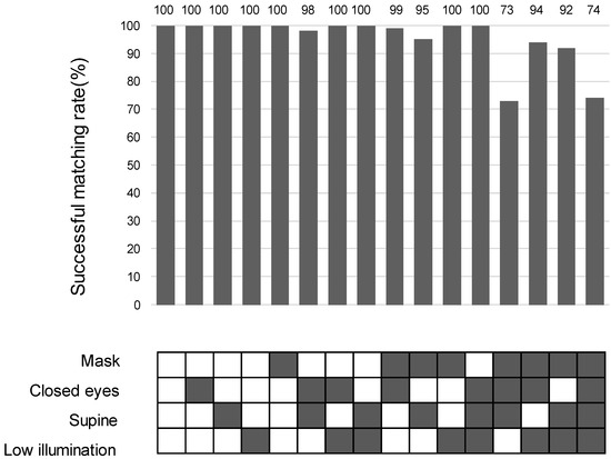 Frequency of successful matches in 16 combinations of mask-wearing, eye closure, body position, and illumination. The rate of successful matches can be indicated as [(1-FRR) × 100 (%)]. The frequency of successful matches is shown in the upper part, and the 16 patterns are in the lower part. In the lower panel, solid boxes = conditions with mask, closed eyes, supine, sufficient or low illumination. The exact numbers are provided in the top row of the matching rate bar chart.
