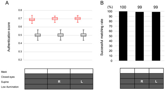 Authentication scores (A) and successful matching rates (B) in the nighttime condition. All images were taken under the low illumination condition. In the lower panel, solid boxes = conditions with mask, closed eyes, supine, and low illumination; R = right lateral position; L = left lateral position. In the upper panel in (A), red boxes = scores for correct patients, and black boxes = scores for wrong patients. The exact numbers are provided in the top row of the matching rate bar chart.