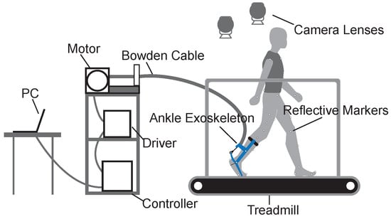 We used a gait experimental platform to collect data on the preliminary metrics of human walking balance (Figure 1). The experimental platform consisted of a force-measuring treadmill, an optical motion capture system, and an ankle exoskeleton system. The ankle exoskeleton system was driven by an off-board actuation system with a Bowden cable and controlled by a real-time control (DS1202, dSPACE, Paderborn, GmbH) system.