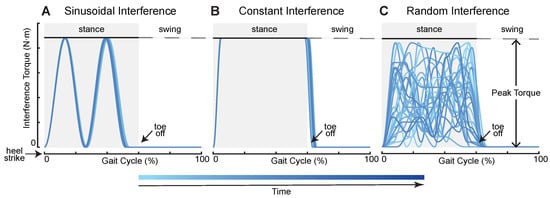 To create external interference for subjects during their walking, we first defined four interference torque profiles, sinusoidal interference torque (SIN), constant interference torque (CON), random interference torque (RAN), and mixed interference torque (MIX). The first three profiles are shown in Figure 2. SIN consisted of two positive continuous sinusoids which started at heel strike and ended before toe off. The SIN had two peak values that were given at the ankle joint mainly during the mid-stance and terminal stance phase. The CON was similar to a step signal whose maximum torque remained the same. We used two cubic splines to form the rise and fall phase of the CON. The RAN was generated by random combinations of sine and cosine signals. Its curves changed each stride, and peak values were applied to the ankle joint at any time during the stance phase. The MIX was a combination of the first three interference torque profiles whose order was SIN–CON–RAN–SIN–CON–RAN, and the duration of each application of interference torque was the same. We used two parameters to limit the generation of torque profiles: peak torque and applied time. Peak torque refers to the maximum allowable torque that the subjects could bear. The peak torque of each subject is shown in Table 1. Applied time refers to the time when the interference torque was applied to subjects from the first heel strike to the ground. For safety reasons, we only applied ankle interference in the supporting phase (0–60% of a gait cycle) during walking. The interference torque was tracked using a combination of proportional–derivative control and an iterative learning algorithm [,]. The effectiveness of this torque control method has been demonstrated in the previously published literature. The torque controller can be found in previous articles [,].