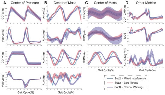 The changes in the preliminary metrics. (A) The changes in the positions and velocities of the COP. (B) The changes in the accelerations of the COM in three directions and the resultant acceleration. (C) The changes in the positions of the COM. (D) The changes in the relative position between the COP and CMP, MOS, and trunk angular acceleration. The blue curves show the changes for subject2 under the ZT condition. The red curves show the changes for subject2 under the MIX condition. The purple curves show the changes for subject8 with CMT under the NW condition. The shadow areas show the fluctuation range of different gait cycles.