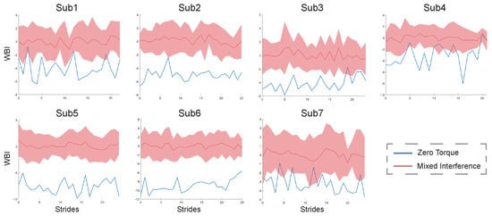 The values of personal WBI for seven healthy subjects. The blue curves are the WBI of each stride under the ZT condition. The red curves and areas are the mean and fluctuation range of the WBI under the MIX condition.