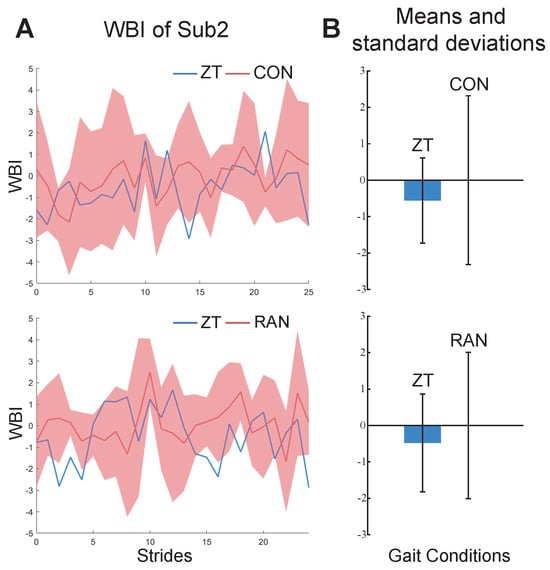 The results of WBI for subject2. (A) The WBI under ZT and CON conditions (above). The WBI under ZT and RAN conditions (below). (B) Bars and whiskers are means and standard deviations of the WBI for subject2 under ZT and CON conditions (above) and ZT and RAN conditions (below).