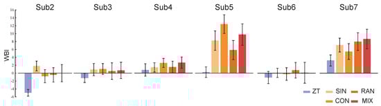 The values of the WBI for the six healthy subjects using the general index constructed from one subject’s data obtained under ZT and MIX conditions. Bars and whiskers are the means and standard deviations of the WBI for six healthy subjects under different gait conditions.