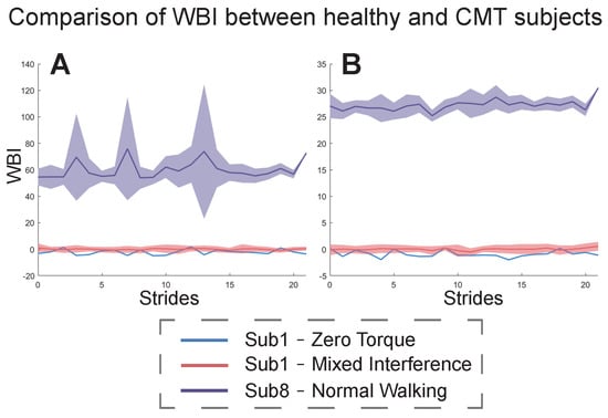 Figure 7 shows the results of the WBI for the CMT patient (subject8) under the NW condition with respect to subject1 under ZT and MIX conditions. The index in Figure 7A was constructed from subject8’s NW condition and subject1’s MIX condition. The index in Figure 7B was constructed from subject1’s ZT and MIX conditions. In both cases, the mean and fluctuation range of the CMT subject’s WBI was much larger than that of the healthy subject.