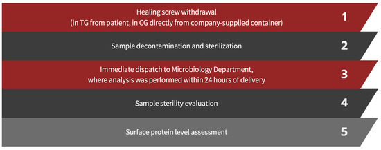For the purpose of the study, 40 healing abutments in the TG and 35 in the CG were analyzed. The steps to which the screws in both groups were exposed are outlined as follows (Figure 1).