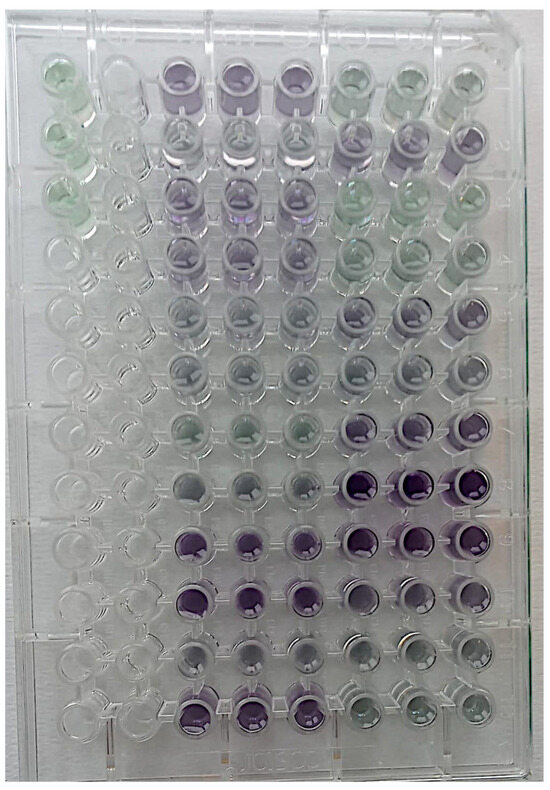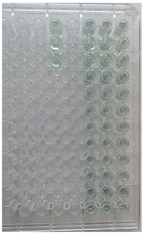 Figure 6. Aliquots of 150 µL were added to 96-well plates in triplicate. All tubes retain the green coloring as the reaction to test for surface proteins has not yet been performed. The three sterile tubes free of HAs and containing only BCS are placed apart on the left to distinguish them from the sample under examination.