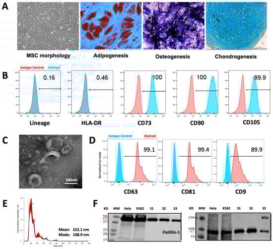 Characteristics of MSCs and MSC-EVs. (A) MSC morphology and tri-lineage potential (adipogenesis, osteogenesis, chondrogenesis) assessment. (B) FC histogram showing MSC surface phenotype profiles for lineage specific markers (CD14, CD19, CD34, CD45), HLA-DR, CD105, CD73, and CD90. (C) TEM image showing EV morphology. (D FC histogram showing positive expression of EV markers CD63, CD81, and CD9. (E) NTA analysis showing EV size distribution. (F) Western blot analysis showing positive expression of EV markers Flotillin-1 and Alix in three independent MSC-EV examples (S1 to S3).