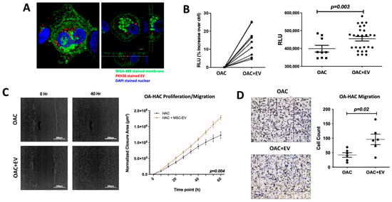 Transferring EV cargo into target cells is a major mechanism for EV-mediated molecular and functional modulation of the target cells. To confirm uptake of MSC-EVs by OACs, OACs were co-cultured with PKH26-stained MSC-EVs. The presence of MSC-EVs inside OACs was observed after only one hour of co-incubation (Figure 2a), indicating rapid communication potential between MSC-EVs and OACs.