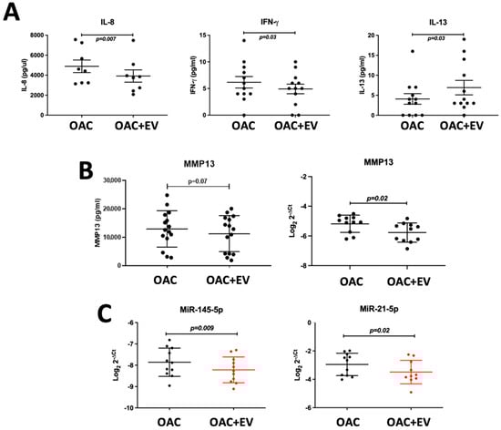 To assess the effect of MSC-EV treatment on OAC cytokine and catabolic protein production, we analyzed the supernatants collected from 24 h monolayer co-cultures of OACs in the presence or absence of MSC-EVs using a multiplex immunoassay. MSC-EV-treated OACs produced significantly decreased pro-inflammatory cytokines IL-8 (p = 0.007) and IFN-γ (p = 0.03) and increased anti-inflammatory cytokine IL-13 production (p = 0.03) (Figure 3a). The production of other pro-inflammatory cytokines (IL-1β, IL-6 and TNF-α) was below the detectable level at the 24 h co-culture time point. Production of the catabolic ECM proteinase MMP13 was also decreased in MSC-EV-treated OACs (p = 0.07) (Figure 3b), as detected by the ELISA analysis of the co-culture supernatants. MMP13 downregulation (p = 0.02) after 24 h co-culture was confirmed at the mRNA level (Figure 3b).