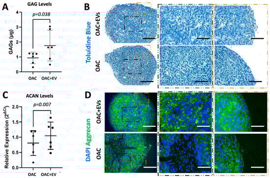 Chondrogenic potential of MSC-EV-treated OACs in a 3D spheroid model. (A) Quantification of sGAG production in OAC and OAC + EV samples. (B) Representative histological analysis of toluidine blue, which stains sGAGs, on tissue slices from three independent experiments (scale bar = 200 µm). Zoomed image is shown in the center and in the peripheral zone of the spheroid slice (scale bar = 125 µm). (C) ACAN relative expression via RT-qPCR, for OAC and OAC + EV, at day 21 with respect to day 2. (D) Representative IHC of aggrecan on tissue slices for OAC and OAC + EV samples (scale bar = 200 µm). Zoomed image is shown in the center and in the peripheral zone of the spheroid slice (scale bar = 125 µm). (A,C) Significance was calculated using the paired t-test and lines represent mean ± SEM. The significance threshold for p-values was p < 0.05.