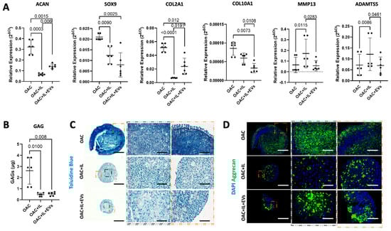 Effect of MSC-EVs and IL-1β on OAC chondrogenic gene expression and ECM component. (A) Relative gene expression of ACAN, SOX9, COL2A1, COL10A1, MMP13, and ADAMTS at day 10 with respect to day 2. (B) Quantification of sGAG production in digested spheroids formed from OAC, OAC + IL, and OAC + IL + EV samples. (C) Representative histological analysis of Toluidine blue staining GAGs from three independent experiments. Scale bars represent 200 µm and 125 µm, respectively, for original and zoomed-in areas, as indicated. (D) Representative IHC of aggrecan staining on tissue sections of OAC, OAC + IL, and OAC + IL + EV samples from three independent experiments. Scale bars represent 200 µm and 125 µm, respectively, for original and zoomed areas, as indicated. (A,B) Significance was calculated using one-way ANOVA and lines represent mean ± SEM. The significance threshold for p-values was p < 0.05.