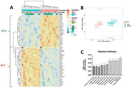 Gene expression profile of MSC-EV-treated OACs compared to OACs. (A) Heatmap shows unsupervised hierarchical clustering of 54 genes that were significantly differentially expressed between groups: each column represents an individual sample. OAC + EV are depicted in blue, while control OACs are depicted in pink. Patient gender (green, purple) and age (green scale) are also indicated. Relative expression changes are indicated by the color scale (red: high; blue: low). (B) Principal component analysis of MSC-EV-treated OACs vs. control OACs. (C) Reactome pathway analysis for genes significantly differentially expressed between OAC + EV and OAC controls. Both analyses indicate the number of genes implicated in each pathway.