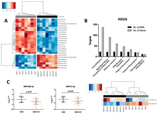 Assessing the microRNA expression differences revealed 24 differentially expressed microRNAs (Log2 FC range = −1.30–1.22, p-value range p < 0.001–0.04), whereby 17 were downregulated (Log2 FC range = −1.30–−1.03, p-value range p < 0.001–0.04) and 7 were upregulated (Log2 FC range = 1.03–1.22, p < 0.001–0.04) in OAC + EV (Figure 7a).