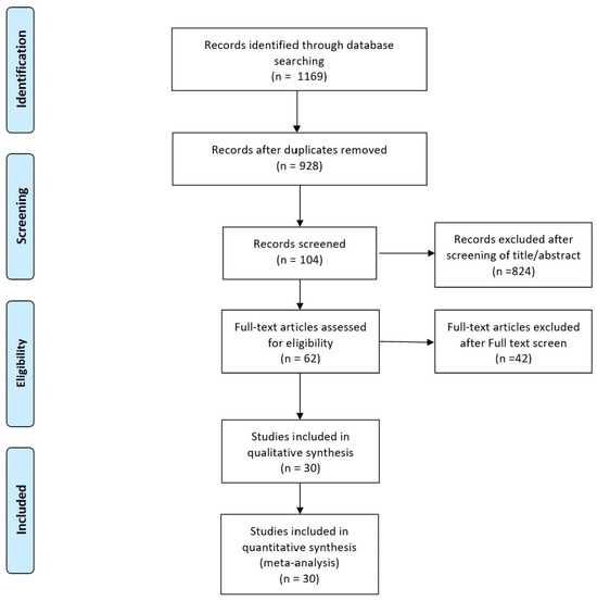 A study flow diagram showing the process for study identification, inclusion, and exclusion is provided (Figure 2). The initial electronic search yielded 1169 studies. Three additional publications were obtained through manual searching. In total, 104 potentially eligible studies were assessed for inclusion after screening the titles and abstracts. After we reviewed the full texts, an additional 42 studies were excluded, leaving 30 studies for the final analysis.