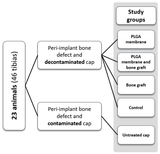 Although the implant insertion site in the tibia lacks an infectious microbiome per se, as reported by Sousa et al. [17], it is possible to use caps previously contaminated with certain bacterial microcosms present in PI (including Streptococcus spp., Actinomyces spp., Staphylococcus spp., Candida spp., Veillonella spp.), which make it possible to evaluate the antibacterial capacity of the biomaterials used and the osteogenic repair achieved in peri-implant defects over different periods of time.