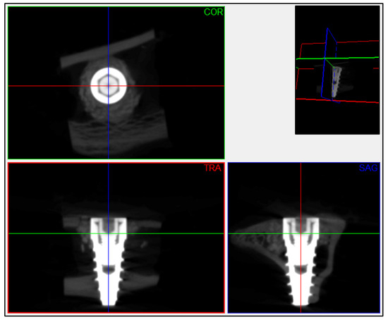Example of the spatial reorientation applied to each scanned sample using DataViewer v.1.5.6.2 software (Bruker-microCT, Kontich, Bélgica), matching the axial axis and center of the implant. The images oriented in the coronal plane were extracted for subsequent segmentation and analysis of the images. COR: coronal plane; TRA: transverse plane; SAG: sagittal plane.