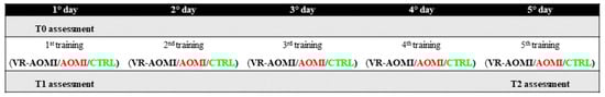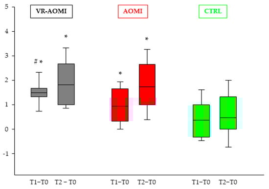 | VR-AOMI | T0 | T1 | T2 | d (CI95) T1–T0 | d (CI95) T2–T0 |