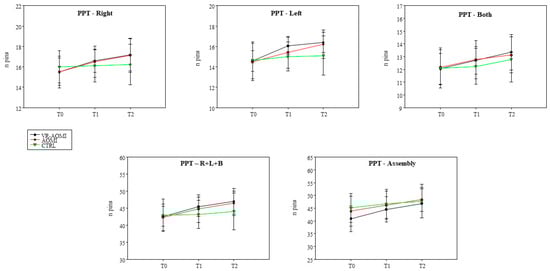 3.1. The Effects of AOMI Applied through VR on Manual Dexterity Assessed with the Purdue Pegboard Test
