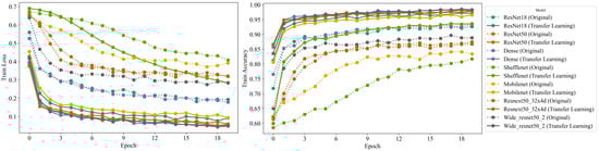 Among the evaluated architectures, most models achieved rapid convergence and high accuracy within the initial training epochs. In particular, ResNeXt50 and Wide ResNet50 demonstrated exceptional performance, reaching over 95% training accuracy in the early stages. These findings highlight the importance of network depth and design principles in enabling effective feature propagation during transfer learning.