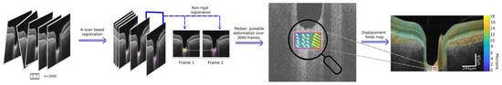 Pipeline to process data. A 3000-frame OCT video is acquired. Images are aligned by a global and a finer A-scan-based rigid registration. Non rigid registration is applied to obtain displacement fields that describe tissue changes between every pair of images. Displacement vectors are calculated for every pair of images, and the median absolute value of this field is calculated for the whole video. Finally, a graphical representation of the local changes in the median pulsatile displacement on one B-scan is obtained.