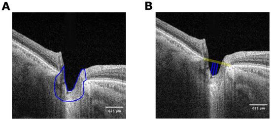The same observer (MMS) manually traced the ONH area in all cases and the Bruch’s membrane openings (BMO) as references (Figure 2A). The area between the internal limiting membrane and the RPE/Bruch’s membrane complex was manually delimited in both the nasal and temporal retina. The lamina cribrosa and prelaminar tissue depth were measured using the BMO plane to the deepest level of the cup (the most anterior portion of the prelaminar tissue) [44]. First, a line was drawn at the maximum point, and then two other lines were traced, one nasal and the other temporal, 100 microns from this line. The mean distance of these three measurements was defined as the anterior prelaminar tissue depth and lamina cribrosa depth (Figure 2B).