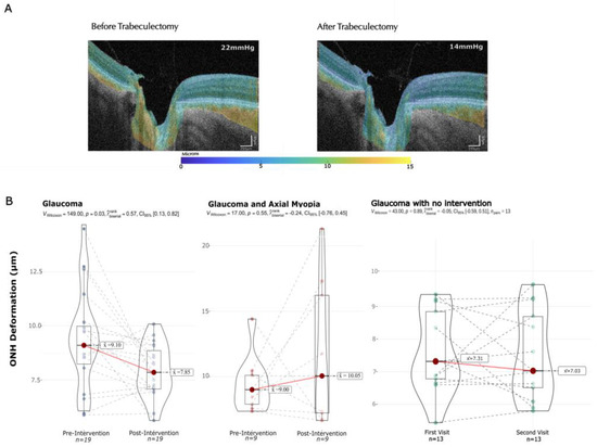 Median pulsatile displacement changes before and after IOP decrease. Panel (A): Example of pulsatile displacement maps corresponding to a subject before and after trabeculectomy with an IOP decrease of 8 mmHg. Panel (B): Median pulsatile displacement changes in the ONH in glaucoma, glaucoma plus myopia and control cohorts.