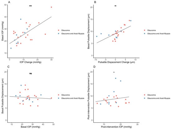 Preoperative intraocular pressure has been identified as a predictor of IOP reduction following glaucoma treatment and cataract surgery [59,60,61]. Our data support this evidence. We demonstrate that a higher basal IOP is correlated with a more substantial IOP reduction. Similarly, the basal pulsatile displacement is correlated with a greater change in displacement as part of the response to treatment. This correlation is independent of the absolute value of IOP reduction, which could provide additional information regarding the treatment response.