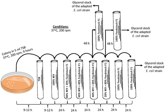 As already shown [20], E. coli A1:ldhA cells are capable of selectively catabolizing carbon sources, i.e., glucose and AA, without catabolizing LA. Feedstock F1 was used to confirm that the E. coli A1:ldhA strain is able to grow on such feedstock; an adaptation method followed, starting from 100% synthetic M9 media supplemented with 0.5 g/L glucose, 0.5 g/L AA, and 5 g/L LA as the substrate to a final substrate comprising 100% feedstock F1. The methodology is schematically presented in Figure 2. A single colony of the E. coli strain was picked from tryptic soy agar (TSA) plate and initially inoculated in 5 mL tryptic soy broth (TSB) culture media. In total, 4% v/v of the grown cells in TSB were inoculated in 100% synthetic media (i.e., M9 minimal media supplemented with 5 g/L glucose, 0.5 g/L AA and 5 g/L LA) as the substrate in 16 mL glass tubes. After 24 h of fermentation, 4% v/v of the culture was inoculated in 5 mL fresh culture media composed of 80% synthetic media and 20% real feedstock F1. Sequential inoculation of 4% v/v cultivation was repeated every 24 h or 48 h by increasing 20% the part of biological feedstock and, respectively, decreasing the synthetic media aiming at the growth of the strain solely (i.e., 100%) on the feedstock F1. Re-inoculation in 100% feedstock F1 was tested along with direct inoculation from 40:60 M9/feedstock F1 to 100% feedstock F1, and from 20:80 M9/feedstock F1 to 100% feedstock F1. The cells grown on 100% feedstock F1 of each tested case were stored in 25% v/v pure glycerol at −80 °C and plated on agar/biological feedstock plates for further use.