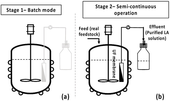 Concerning substances with high physicochemical affinity, a bio-purification process provides a comparative advantage to the conventional physicochemical separation processes [20]. Metabolic engineering advances play an important role behind the bio-purification concept, which is a novel approach for the purification of value-added products. Microorganisms can be used as separation tools since their metabolism can be directed on a target product or a specific activity with very high selectivity. Wang et al. [21] focused on Hg2+ bio-detection and elimination by the engineered E. coli DH5a strain, while Cheng et al. [22] suggested a strategy for the bio-purification of L-arabinose with yeast. Diaz et al. [23] presented a study focusing on preferential consumption of glycose and xylose by E. coli strains for the production of pentose- and hexose-derived products, and Liang et al. [24] established a novel method for the purification of D-tagatose through the selective metabolism of D-galactose by S. cerevisiae. Concerning LA, a bio-purification process for PLA was investigated, based on the selective catabolism of D-lactate over L-lactate by an engineered E. coli strain (DC1001) [25,26]. However, scale-up of such biotechnological processes is challenging, notably due to the difficulty to achieve efficient separation of the active cells from the treated feedstock/target product and to perform fermentation under a semi-continuous or continuous mode that is advantageous for large-scale applications. The membrane bioreactor (MBR) concept (which is an established technology for wastewater treatment) combining a biotechnological process and membrane separation is quite promising to address these issues.