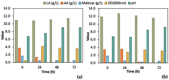 Results from two batch fermentation/bio-purification processes with feedstock F1 in a bench-scale bioreactor with 12 h swift sampling: maltose, AA, biomass, and LA concentration temporal profile; (a) Batch 1; (b) Batch 2.