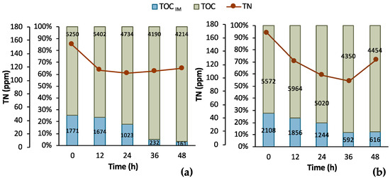 To further assess the process, supplementary data are illustrated in Figure 6 regarding the TOC and TN measurements. It is obvious that a sufficient amount of nitNrogen, higher than 100 ppm, was present in both cases. A significant amount of TOC was removed in both cases, as well. In particular, the total TOC concentration minus the concentration of LA corresponds to the TOC concentration of the impurities (TOCIM) in the biological feedstock. TOCIM reduced from 1771 ppm to 161 ppm within 48 h in Batch 1 and from 2108 ppm to 616 ppm in Batch 2 in same time period. The recorded data are very encouraging for a further investigation and development of the LA bio-purification process in an MBR system.