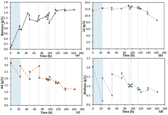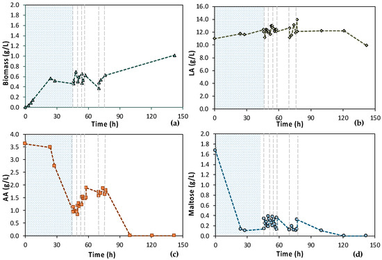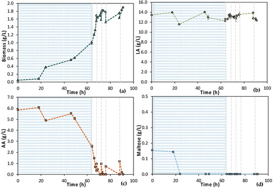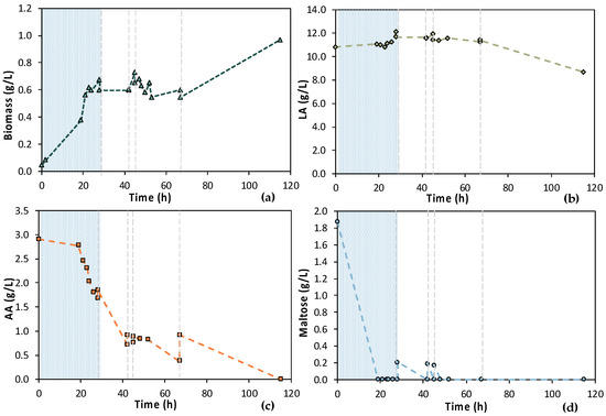 Concentration profiles of (a) biomass; (b) LA; (c) AA; and (d) maltose of the semi-continuous MBR bio-purification performed with feedstock 1 (MBR 3); the textured part corresponds to the 1st stage of the process; dash lines correspond to the beginning of each cycle of the 2nd stage of the process.