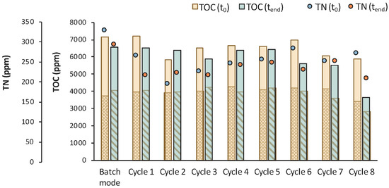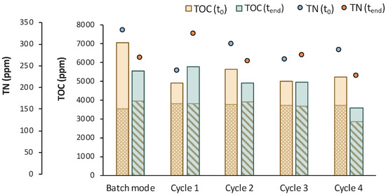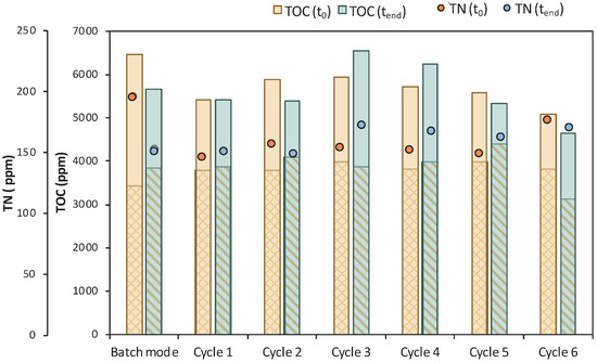TOC measurements of MBR 4 in the beginning (yellow bar) and in the end (green bar) of batch stage 1 and at each cycle of stage 2 of the process; the textured part of the bars corresponds to the TOC concentration of LA in ppm; TN measurements in the beginning (orange dot) and in the end (blue dot) of batch stage 1 and at each cycle of stage 2 of the process.