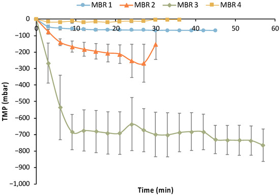 Limited fouling was observed during the 1st MBR experiment based on the data presented in Table 5 and Figure 15, i.e., the maximum TMP drop reached −72 mbar. However, a sharp reduction in average TMP values was observed in MBR 2 and especially in the MBR 3 experiment, reaching −0.7 bar. Thus, it is clear that significant fouling occurred in the MBR 2 and (especially) in MBR 3 experiments. The same custom-made membrane module was used in all these MBR experiments after the implementation of a standard chemical cleaning protocol; the latter comprised a rinsing with clean DI water for at least 1 h, followed by cleaning with 200 ppm NaOCl solution for 1.0 h, a second rinsing with DI water to remove any traces of the NaOCl, and then a typical sterilization step. The reusability of the UF membrane was positively assessed concerning its performance without any significant negative effect in a previous study [29]. However, the characteristics of the biological feedstock used in the present study and the potential growth of other bacteria species (e.g., of Bacillus genus), which have the ability to produce biofilms [35], have probably led to the deterioration of the membrane’s filtration performance. This assumption is also supported by the fact that the membrane’s filtration performance was totally restored (without any change in the preceding chemical cleaning protocol and the sterilization step) during the MBR 4 experiment (Figure 15), when practically no membrane fouling was observed. The insignificant fouling in MBR 4 is also reflected in the respective metrics of Table 5, i.e., the maximum TMP drop was only −45 mbar, which also supports the aforementioned assumption.