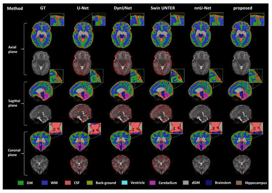 Visualization of the segmentation results on the dHCP dataset. Advanced deep learning brain tissue segmentation methods were compared with the nnU-Net baseline network and our proposed method. Each plane demonstrates the segmentation results of different methods, with the mis-segmentation regions (shown in red) displayed beneath the segmentation outcomes.