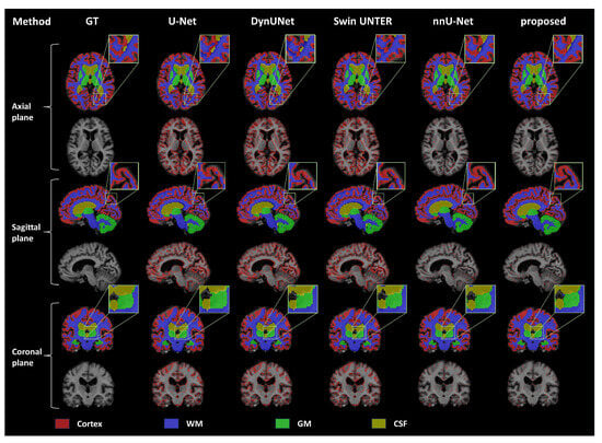 With the rapid development of deep learning, significant progress has been made in brain tissue segmentation methods based on deep learning [1]. These methods use deep learning models such as Convolutional Neural Networks (CNNs) to learn feature representations from large amounts of data, enabling them to automatically learn more discriminative features and achieve better performance in brain tissue segmentation tasks [7,8,9]. In order to address the challenges encountered in brain tissue segmentation, researchers are continuously exploring new methods. Currently, the application of deep learning in brain tissue segmentation primarily relies on U-Net and its derivative networks [10,11,12,13], such as dual-encoder U-Net [14], dynamic U-Net [15], and U-Net integrated with fuzzy information [16]. Additionally, there are brain tissue segmentation networks based on improved Transformer structures, including Swin UNETR [17], which can extract features at different resolutions, and Transformer structures with varying weight configurations [18]. Fabian Isensee and his colleagues have developed a self-configuring method called nnU-Net based on U-Net [19]. On brain tissue segmentation datasets, the excellent architecture of nnU-Net enables it to achieve outstanding performance, demonstrating its strong adaptability and efficiency [20]. Despite the remarkable achievements of deep learning in the field of brain tissue segmentation, it still faces some challenges. Current deep learning methods tend to overlook mis-segmentation regions when processing segmentation results, which leads to suboptimal performance in handling complex scenarios such as blurry boundaries and overlapping anatomical structures.