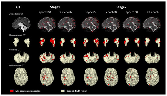 Comparison of the mis-segmentation regions in different epochs of the two stages on the dHCP dataset. Three types of brain tissues (hippocampus, ventricle, and white matter) and the whole brain are visualized. The last epoch is the final round result of this stage. The red region is the mis-segmentation region.