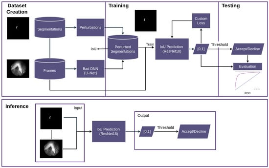 Basic overview of the method. First, bad segmentations were created using an insufficiently trained deep neural network and a newly proposed perturbation procedure. Second, a ResNet18 is trained to predict their IoU. At inference, segmentations are classified as good (“accept”) or bad (“decline”) based on an IoU threshold.