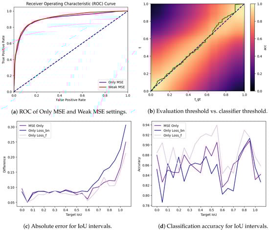 Subfigure (a) depicts the receiver operating characteristic (ROC) curve of the model. It shows the relationship between sensitivity and specificity of the classifier. Subfigure (b) shows the accuracy of the classifier depending on the threshold () on which the continuous IoU of the ground truth and the output of the model is binarized using the threshold t. The green line shows the maximum accuracy, depending on the chosen threshold during inference. Subfigure (c) shows the mean difference between output and ground truth for different IoU intervals of the ground truth. Subfigure (d) shows the accuracy of the model for different IoU intervals of the ground truth.
