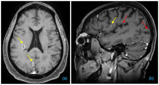 Examples of T1c showing two BM cases. (a) Axial view showing two ring-enhancing BMs indicated by yellow arrows. (b) Sagittal view showing a small BM indicated by a yellow arrow, alongside examples of blood vessels indicated by red arrows.