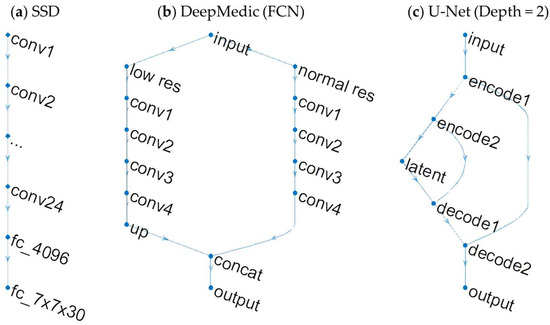 There are three basic network architectures, SSD, FCN, and U-Net, utilized in the reviewed studies (Figure 2).
