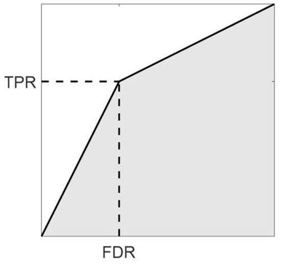 The area under curve (AUC, the shaded region) for the true positive rate (TPR) against false detection rate (FDR) can be approximated as the average of TPR and PPV at an instance of detection threshold.