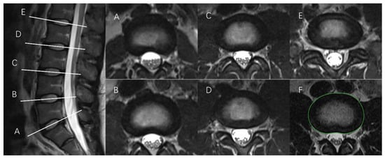 T2-weighted MRI scans of the sagittal lumbar spine at L5/S1 (A), L4/L5 (B), L3/L4 (C), L2/L3 (D), and L1/L2 (E) (left) and corresponding images (i.e., the same alphabet letter) in the transverse plane for the measurement of cross-sectional area (right) (note: subfigure (F) illustrates the outcome of IVD contour tracing, highlighted with the green line).