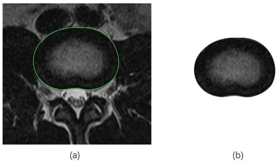 Magnetic resonance imaging (MRI) technology, as a non-ionizing modality, is a rapidly developing clinical diagnostic method and provides the most comprehensive non-invasive evaluation of a greater number of spinal abnormalities owing to its multi-planar capabilities and superior soft tissue contrast []. In addition, MRI scans are also an ideal candidate for image-based applications involving IVD anatomy, geometry, and composition [,]. Clustering-based segmentation is a type of unsupervised segmentation method with high efficiency and better accommodation for untrained low data. Common clustering algorithms, such as fuzzy C-means (FCM) and region growing (RG), have been widely used in a variety of soft tissue segmentation applications (e.g., blood vessels, organs, tumors) [,,], while the RG algorithm has been proven effective in medical image segmentation, including CT and MRI scans, where a clear boundary can be identified between two regions [,,]. Computer-assisted image segmentation has also been used in morphological applications involving musculoskeletal tissues, such as the spine and paraspinal muscles [,,,,]. However, previous investigations of spinal morphology have mainly focused on the peripheral/external dimensions.