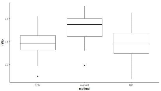 Ratios derived from manual, FCM, and RG methods were 46%, 39%, and 38%, respectively (Figure 6). Tukey’s HSD tests revealed that ratios derived from manual measurements were significantly larger than the ones derived from FCM by 7.1% (p = 0.003) and RG by 7.7% (p = 0.001), respectively, while results derived from FCM and RG were not significantly different (p = 0.960).