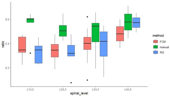 In addition, similar results were found across all four spinal levels, where manual results were significantly larger than FCM- and RG-derived results (p < 0.001, Figure 7).