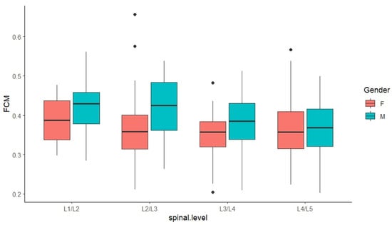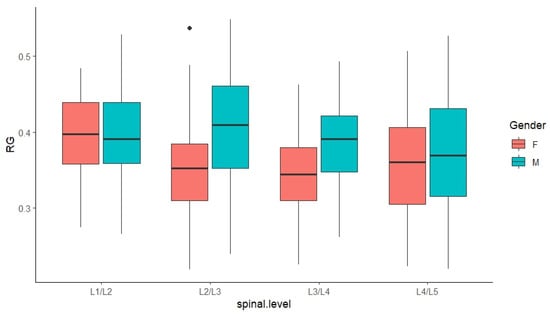 Results from the ANOVA revealed a significant influence of gender (p < 0.001), spinal level (p < 0.05), and their interactions (p = 0.03) on the results derived from the FCM (Figure 8) and RG (Figure 9) methods, respectively. Since significant interaction terms were evident, additional analyses were performed and results were interpreted accordingly.