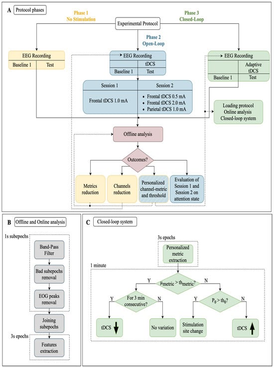 Block diagram of (A) protocol phases (Phase 1, Phase 2, and Phase 3); (B) offline and online data analysis procedures; (C) closed-loop system used in Phase 3 for personalized stimulation adaptation. : average value of the interested EEG metric measured during the Baseline condition—: personalized threshold estimated at the end of Phase 2—: power of the EEG signal in the range (4–8) Hz—: power in the range observed during the Baseline condition.